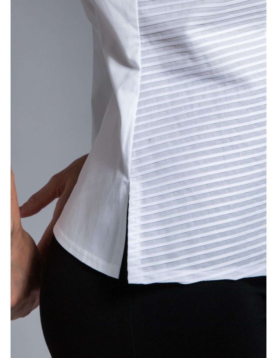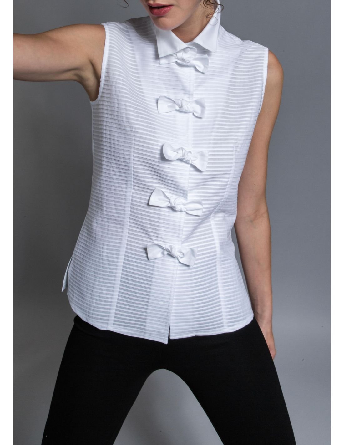 Orné de délicats nœuds le long de la boutonnière, ce modèle revisite le classique chemisier avec une touche d’originalité. Idéal pour une tenue chic et moderne, il s’associe aussi bien à un pantalon habillé qu’à un jean pour un look raffiné en toute occasion.