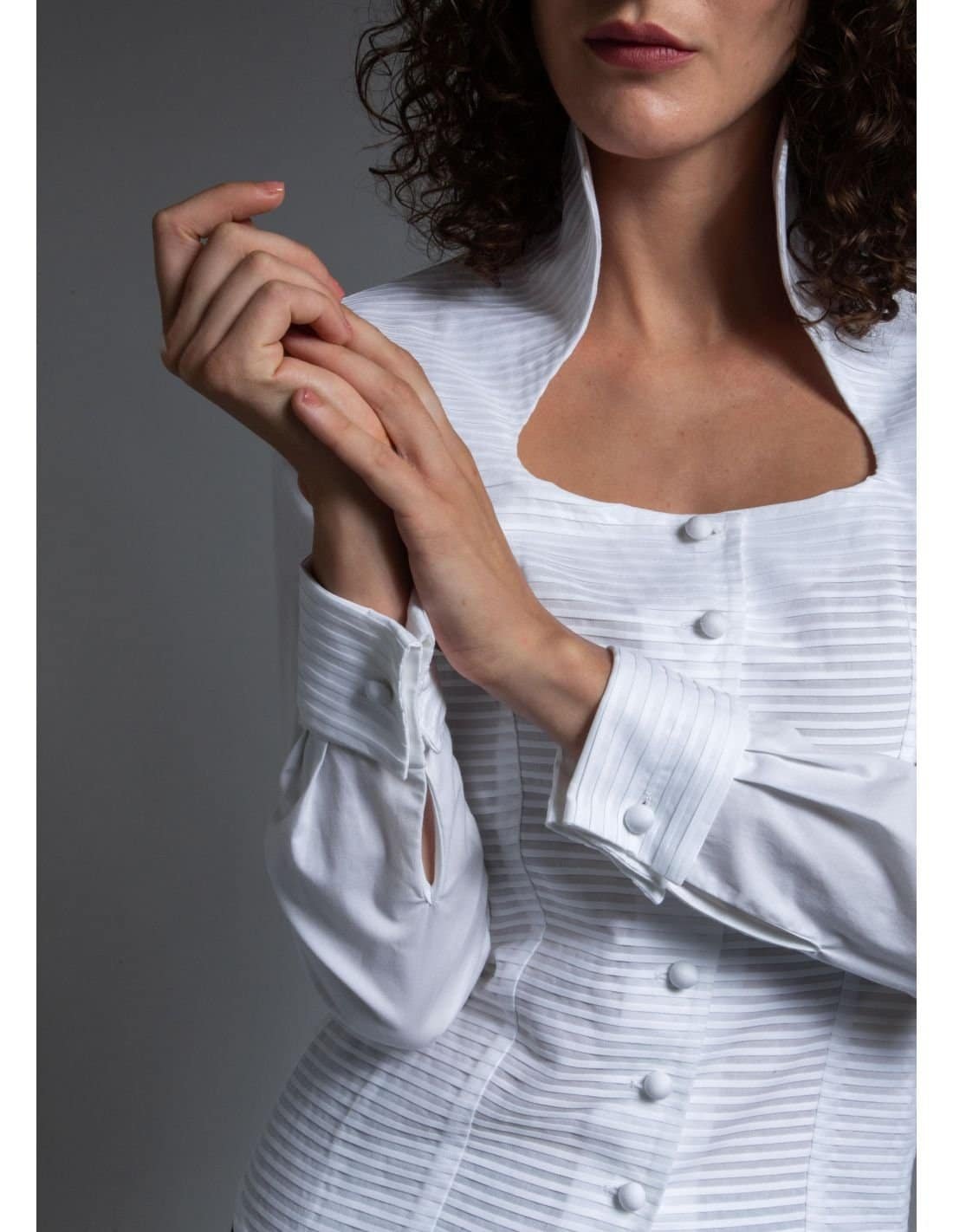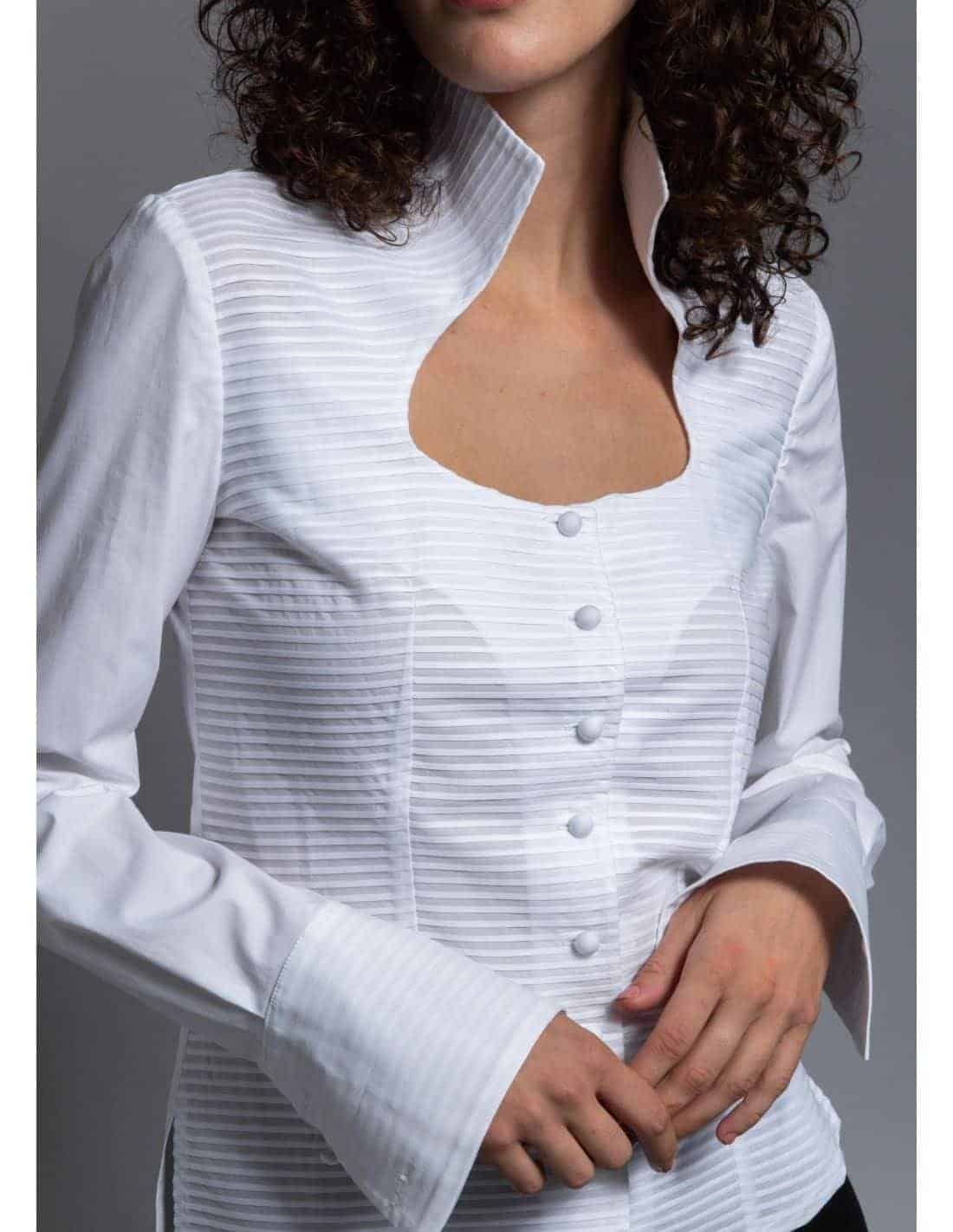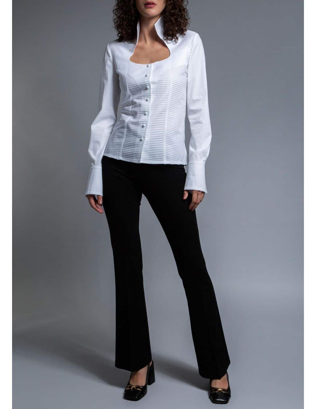 Apportez une touche d’élégance moderne à votre vestiaire avec ce chemisier blanc à manches longues. Son col structuré et son décolleté découpé offrent une silhouette sophistiquée et audacieuse.